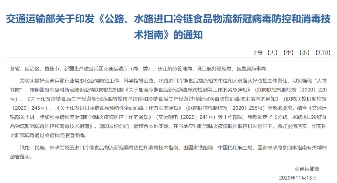 交通运输部进一步规范冷链食品疫情防控!全国多地下发紧急通知!