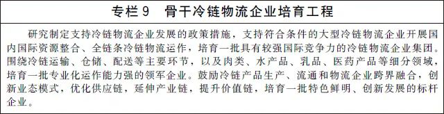 推动第三方冷链物流企业专业化发展、规模化经营和数字化转型,着力培育具有较强国际竞争力的龙头企业。加大冷链物流关键技术和先进装备研发力度,鼓励节能环保技术应用。推动建立冷链物流统计评价体系,准确掌握冷链物流基础要素底数,及时客观反映行业发展情况。完善冷链物流标准体系,强化国内国际标准对接。加大复合型冷链物流专业人才培养力度,壮大多层次冷链物流人才队伍。