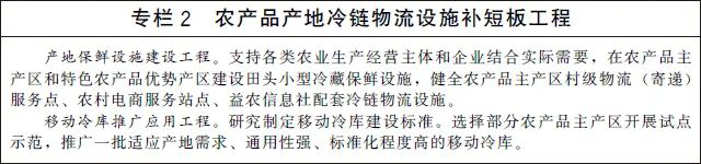 完善冷链源头基点网络。适应不同农产品冷链物流要求,引导家庭农场、农民合作社、农村集体经济组织等在重点镇和中心村,结合实际需要分区分片合理集中建设产地冷藏保鲜设施。发展产地冷链物流设施设备租赁等社会化服务,探索发展共享式“田头小站”等移动冷库,提高产地源头冷链物流设施综合利用效率。