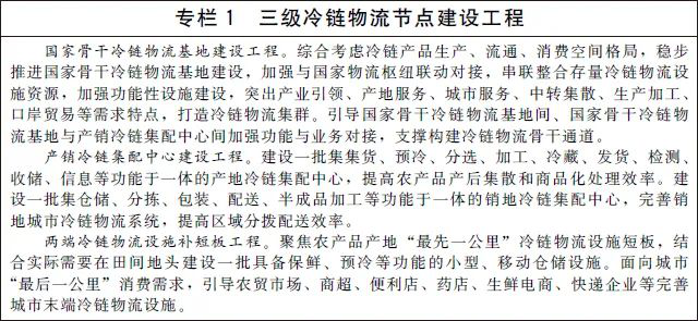 ——基础设施更加完善。依托农产品优势产区、重要集散地和主销区,布局建设100个左右国家骨干冷链物流基地;围绕服务农产品产地集散、优化冷链产品销地网络,建设一批产销冷链集配中心;聚焦产地“最先一公里”和城市“最后一公里”,补齐两端冷链物流设施短板,基本建成以国家骨干冷链物流基地为核心、产销冷链集配中心和两端冷链物流设施为支撑的三级冷链物流节点设施网络,支撑冷链物流深度融入“通道+枢纽+网络”现代物流运行体系,与国家物流网络实现协同建设、融合发展。