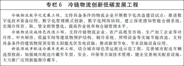 加大绿色冷链装备研发应用。研究制定绿色冷链技术及节能设施设备推广目录,鼓励使用绿色、安全、节能、环保冷藏车及配套装备设施。加快淘汰高排放冷藏车,适应城市绿色配送发展需要,鼓励新增或更新的冷藏车采用新能源车型。研发应用符合冷链物流特点的蓄冷周转箱、保温包装、保温罩等。研究加强冷链物流全流程、全生命周期碳排放管理,加强低温加工、冷冻冷藏、冷藏销售等环节绿色冷链装备研究应用,鼓励使用绿色低碳高效制冷剂和保温耗材,提高制冷设备规范安装操作和检修水平,最大限度减少制冷剂泄漏,推动制冷剂、保温耗材等回收和无害化处理。