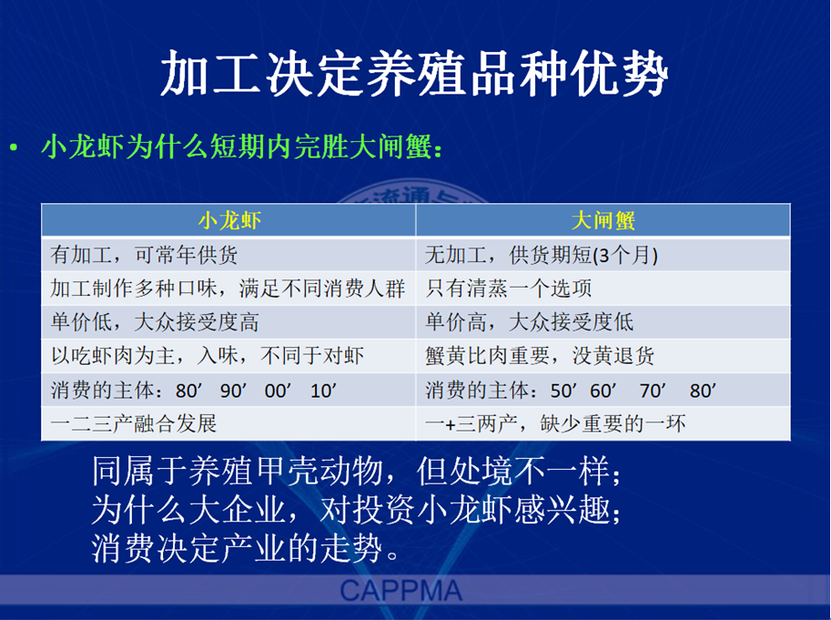 加工决定养殖品种优势:把小龙虾和大闸蟹对比,小龙虾能在短短几年内达到目前的普及度,因为有加工品,而大闸蟹欠缺该环节,所以小龙虾常年可食用,而大闸蟹只有三个月的赏味期;小龙虾口味多样,而大闸蟹基本只能清蒸。甚至加工对品牌的影响也是巨大的。