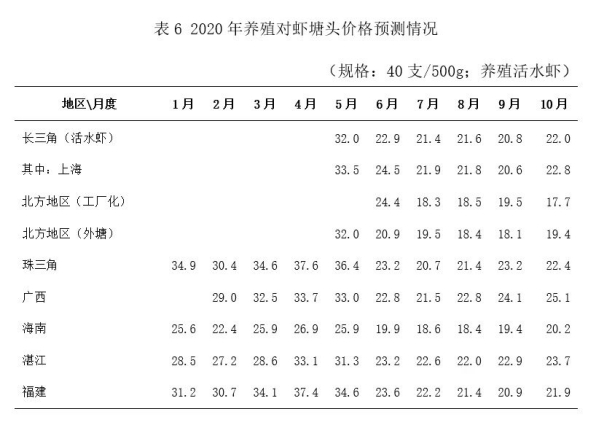 产业经济团队基于2017年~2019年各地塘口价的周(7天记录一次)价格数据,经整理加工后进行加权平均预测。选择的预测品种是40支/500g的养殖南美白对虾活水虾,这是养殖对虾中间具有代表性的规格。利用了采取距离预测年份越近赋权重值越高的思路。对于年度之间数据有部分缺失情况,采取权重值调整的办法处理;缺失数据较多的地区和月份放弃预测。