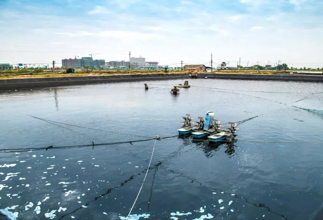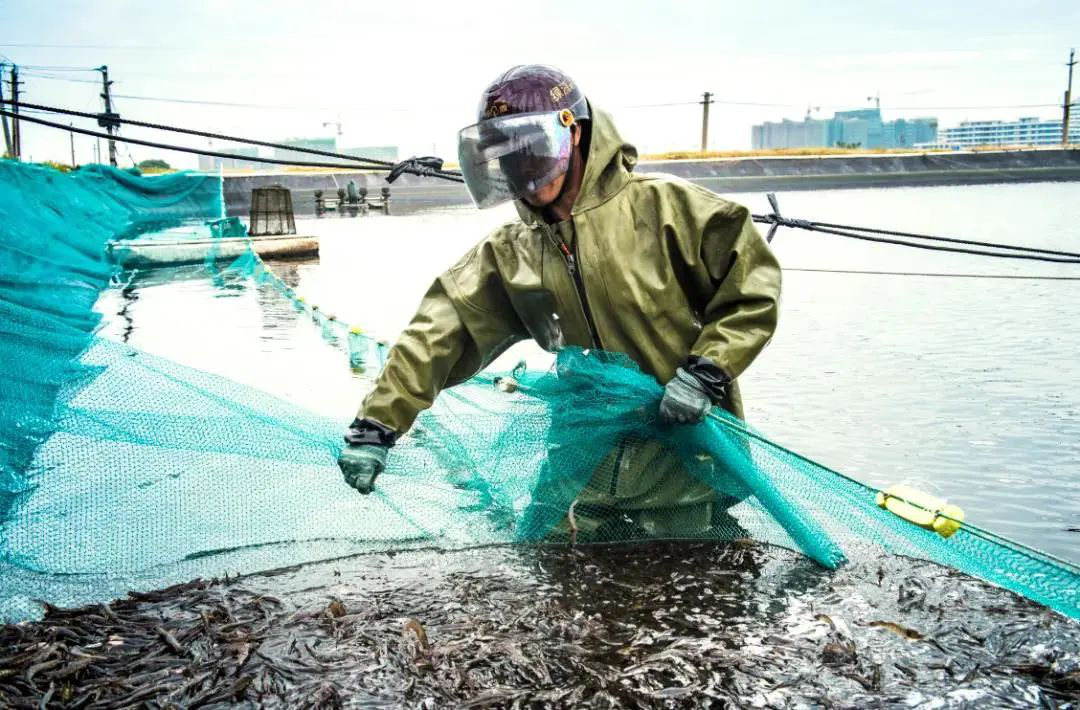 远近处看,黑胶纸塘的海水比周边水塘颜色更深,被一方池塘滋养了80天的鲜虾们,开始被捕捞。一筐一筐的虾,虾体表面泛着青色,阳光下通体透明无暇。