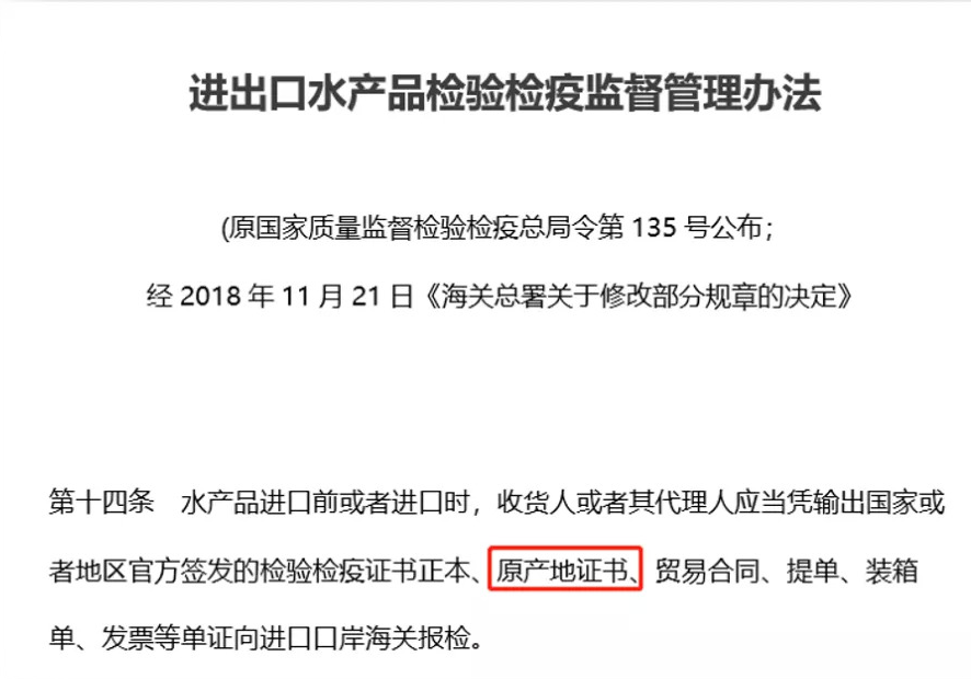 做进口水产品的商家都知道,除了一般的单证以外,还有几样东西缺一不可:出口国官方卫生证书、动植物检疫许可证(对于部分水产品),和原产地证书。因为这是《进出口水产品检验检疫监督管理办法》明文规定的: