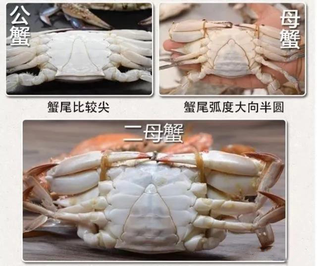 辨别螃蟹,全都看白色的一面。螃蟹白面的纹路越深,螃蟹越老,也越肥美。